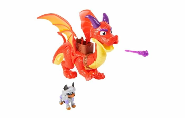 Deze set actiefiguren bevat een uniek figuurtje van Claw de pup, een grote Draak Sparks-figuur met supervleugels, twee projectielen en een zadel waar Claw op kan zitten. Zowel Sparks als Claw hebben authentieke details en zien er net zo uit als de personages in de tv-serie. Als het tijd is om te vliegen, gebruik je de clip van het zadel om Claw op zijn plaats te houden. Houd Sparks dan vast bij de staart en druk de gebruiksvriendelijke knop op zijn staart in om zijn supervleugels te laten bewegen. Laat je draak en pup rondvliegen, net als in de tv-serie, en druk op de hoorns van Sparks om de vuuradem-projectielen te lanceren. Inhoud: 1 draak, 1 pupfiguur, 2 projectielen. Wordt geleverd in touchbox. Geschikt voor kinderen vanaf 3 jaar.