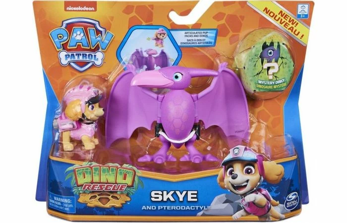 vrienden op spannende dinoreddingsmissies met de Dino Rescue Pup- en Dino-sets. Deze figurenset bevat Skye, een grote Pterodactylus en een verrassingsminidinofiguur. De geliefde pup van de PAW Patrol draagt haar Dino Rescue-reddingsuniform en is klaar voor actie. Druk op de badgeknop van Skye om het gereedschap op haar rugzak uit te klappen. Druk vervolgens op de knop aan de achterkant van de Pterodactylus om de vleugels te laten fladderen. Open de verpakking en kijk welke kleurrijke dinosaurus jij krijgt voor al je reddingsavonturen. Met drie geweldige figuren brengt deze set al het prehistorische plezier van de populaire tv-serie tot leven. Verzamel alle Dino Rescue Pup- en Dino-sets (afzonderlijk verkocht) om telkens weer je eigen reddingsmissies te maken. Met Skye en haar Pterodactylus kun je urenlang je eigen avonturen beleven.