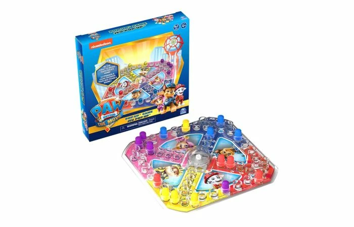 Elke speler kiest een Paw Patrol-pup om mee te spelen (Chase, Marshall, Rubble of Skye) en plaatst zijn 4 gekleurde verhuizers op de overeenkomstige startvelden. Druk op het middenstuk van de pop-up om de dobbelsteen te rollen en verplaats vervolgens één of meer van je pionnen met de klok mee over het bord. Maar kijk uit! Als een andere speler op jouw pion landt, wordt deze teruggestuurd naar Start! Bereik als eerste jouw honk met alle 4 pionnen en je wint het spel! De pionnen passen in de verzonken ruimtes op het bord. De pop-up koepel in het midden houdt de dobbelsteen op zijn plaats: geen dobbelstenen te verliezen! Inhoud: speelbord met pop-up dobbelsteen, 16 gekleurde verplaatsingsstukken en instructies. Wordt geleverd in full-colour doos. Geschikt voor 2 tot 4 spelers vanaf 4 jaar.