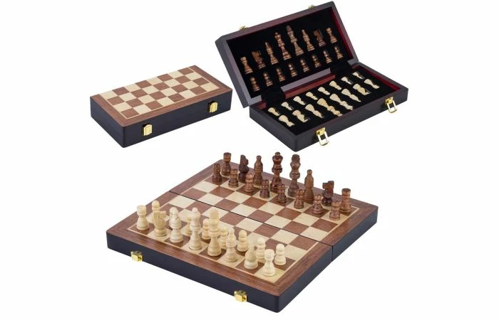 Houten schaakspel van essenhout. Handig: het bord is opklapbaar. De speelstukken kunnen opgeborgen worden in het bord. Afmetingen: 30 x 30 x 5,5 cm. Geschikt voor kinderen vanaf 6 jaar.