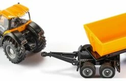 De snelle JCB 8250 trekt een 3-assige kiepwagen met kantelbak, die op een chassis van een dolly met 2 assen is gemonteerd. De voertuigcombinatie is uitgerust met velgen getrouw naar het origineel en banden van stroef kunststof met origineel profiel.