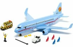 Het grote vliegtuig (38,5 cm) met de twee indrukwekkende motoren staat klaar om in te stappen. Maar wie zit waar? Het cabinepersoneel kan eenvoudig de voorste afdekking in het dak optillen om de vier passagiers die al plaatsgenomen hebben te verplaatsen. In de achterste afdekking is een laadruimte voor de favoriete auto die op vakantie kan worden meegenomen. Ready for Take-off. Het vliegtuig staat op de startpositie. Volle kracht, het vliegtuig wordt sneller en sneller, stijgt op en het landingsgestel kan worden ingetrokken. Klaar maken voor de landing: landgingsgestel uitklappen en de landingslichten inschakelen. De LED gaat na tien minuten automatisch uit. Het vliegtuig is geland, nu wijst een volledig bedrukt Folow-me voertuig met verlichting rondom het vliegtuig de weg op de manoeuvreerzone. Een schok en het grote vliegtuig hangt aan de sleepstang van de vliegtuigsleper. De marshaller wijst de chauffeur de definitieve parkeerpositie. De nieuwe luchthaven set (artikelnummer 6312) is een ideale uitbreiding bij het verkeersvliegtuig.