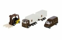De bruine bestelwagens van UPS maken al jarenlang deel uit van het straatbeeld. De flinke bezorgers springen uit de wagens en sprinten met het pakket naar de klant. Maar hoe komt het pakket bij de bezorger? Met de UPS Logistiek set wordt de gecompliceerde logistiek van de pakketbezorging begrijpelijk uitgelegd en wordt het een spannend spelthema. De set bestaat uit een vorkheftruck, een 3-assige trekker en een bestelwagen in de bekende UPS kleuren. De hefmast van de Linde vorkheftruck kan bewegen en daarmee kan ook de kofferopbouw worden geladen. Hiervoor kunnen de achterdeuren worden geopend. De chauffeurscabine en de chassis van de 3-assige trekker en de middenasaanhangwagen zijn van metaal. Ook de bestelwagen is volledig van metaal.