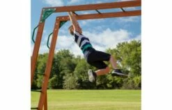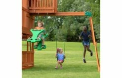 Van drakengevechten tot theekransjes, de Backyard Discovery Skyfort II zal de fantasie van je kinderen en je landschap in de kijker zetten. Met zijn zonovergoten clubhuis, ruime veranda en kraaiennest, compleet met een eigen telescoop, zal dit torenhoge speelterrein aanvoelen als hun eigen houten kasteel. En er zijn tal van leuke, veilige manieren om zich te bewegen rond dit persoonlijke paleis: een volledige lengte van apenstaven zwaait ze recht in het verhoogde clubhuis, een uitdagende rotswand maakt het mogelijk om direct op de veranda te klimmen en via een 305 cm lange golvende glijbaan glippen ze terug naar beneden. Een pauze nodig om bij te komen van het beschermen van het fort? Neem plaats op een ontspannende schommel of pak een hapje aan de picknicktafel. Daarna is het weer tijd om over het koninkrijk te heersen!