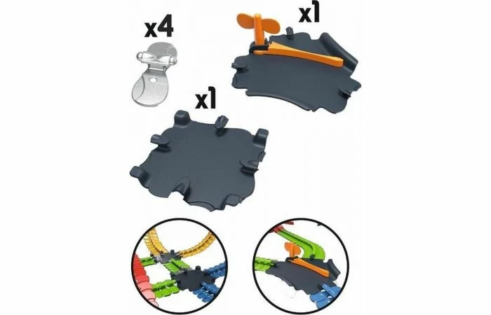Ontdek FleXtreme, het circuit dat tot de verbeelding spreekt! Het bestaat uit flexibele banen en voertuigen en je kunt een circuit maken door de onderdelen samen te voegen. Dankzij uw creativiteit en de omgeving om u heen, zullen u en uw kinderen in staat zijn om het meest ongelooflijke circuit mogelijk te maken! De rails passen gemakkelijk in elkaar en zijn zo flexibel dat je de rails over een stoel, bed of dressoir kunt laten lopen. Maar niet alleen! Lussen, ondersteboven, opzij … Deze set accessoires maakt het FleXtreme-assortiment compleet en stelt je in staat om nog meer gevarieerde en leuke circuits te creëren! Het is samengesteld uit een uitwisseling, een kruising en 4 stuks omgekeerde delen. Het omgekeerde stuk is een symmetrische schakel, die wordt gebruikt om 2 accessoires met hetzelfde uiteinde te verbinden. Hiermee kunt u eenvoudig verschillende sporen of verschillende circuits aansluiten, zonder dat u een reeds gemaakte assembly hoeft te demonteren. Met het knooppunt kunt u verschillende opties op hetzelfde circuit creëren, en rondrittencircuits (mogelijkheid om handmatig de richting van de auto te kiezen). Crossing kan worden gebruikt om een lus op een circuit te maken of om twee verschillende tracks enz. Voor kinderen vanaf 4 jaar.