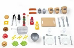Met de grote zomerkeuken kun je mama en papa nadoen en grote barbecues organiseren! Samengesteld uit een plancha, een grill met intrekbare vlammen en een friteuse, zal deze keuken u toelaten om goede maaltijden te bereiden! Ook de afwas doe je dankzij de spoelbak die is voorzien van een waterpomp. Een veertigtal accessoires zijn inbegrepen, waaronder etenswaren (friet, hamburger, kebabs, salade …) en gebruiksvoorwerpen (tangen, aanstekers, bestek, borden, snijplank …). Je kunt zelfs de kleine potjes gebruiken om echte kruiden te planten.