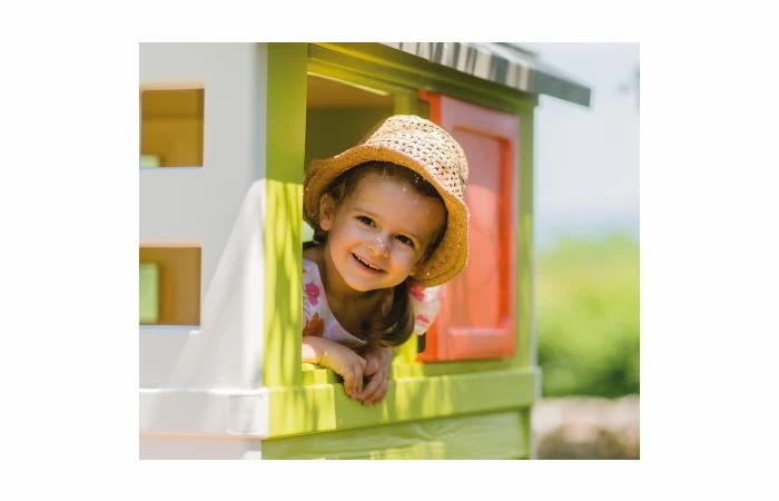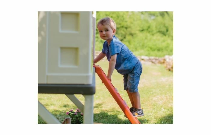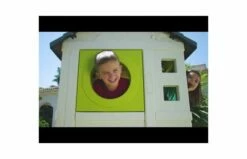 Terwijl een van je kinderen plezier zal hebben met de glijbaan, kan de ander duizend verhalen op de veranda van het huis bedenken! Je kleintjes kunnen verstoppertje spelen dankzij de twee schuifdeuren waarmee ze het spel kunnen winnen!