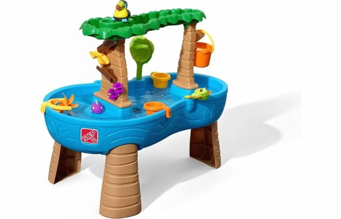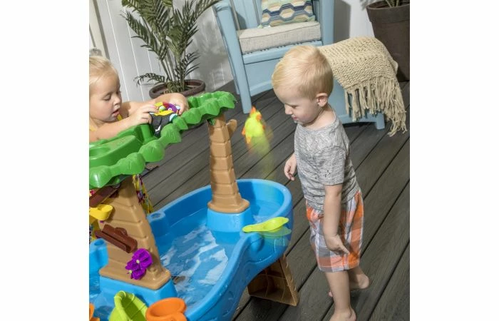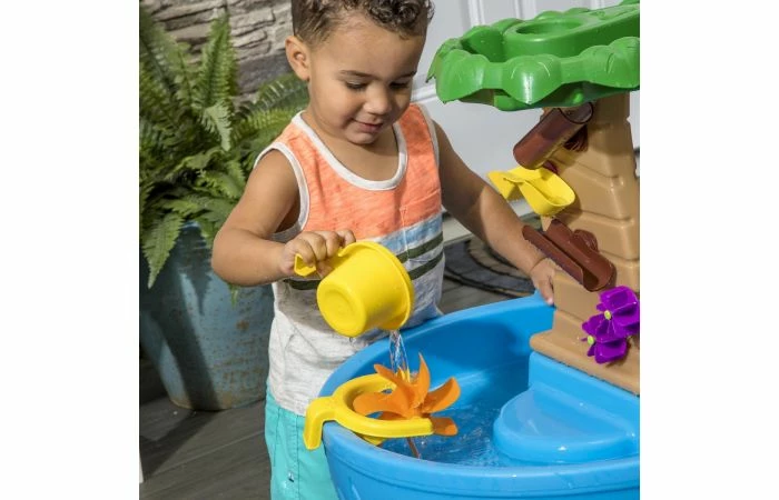 Verander je achtertuin in een tropisch paradijs met de watertafel Tropical Rainforest van Step2! Het bovenste gedeelte van deze jungle-watertafel voor peuters is vormgegeven als het bladerdak van het regenwoud, waardoor een leuke tropische sfeer ontstaat! Kleintjes kunnen de grote schep gebruiken om water over de boomtoppen te gieten, zodat het in de waterbak eronder regent! Kijk hoe de waterval langs de boomstammen naar beneden stroomt en de waterdoolhofspinner en de wipwap activeert, waardoor ze spelenderwijs oorzaak en gevolg leren kennen. Deze grote watertafel voor peuters heeft een ruim ontwerp, zodat meerdere kinderen samen kunnen spelen.