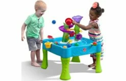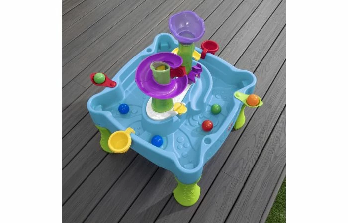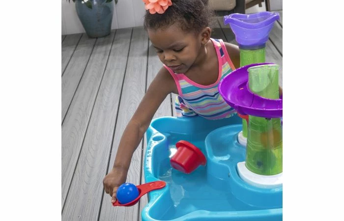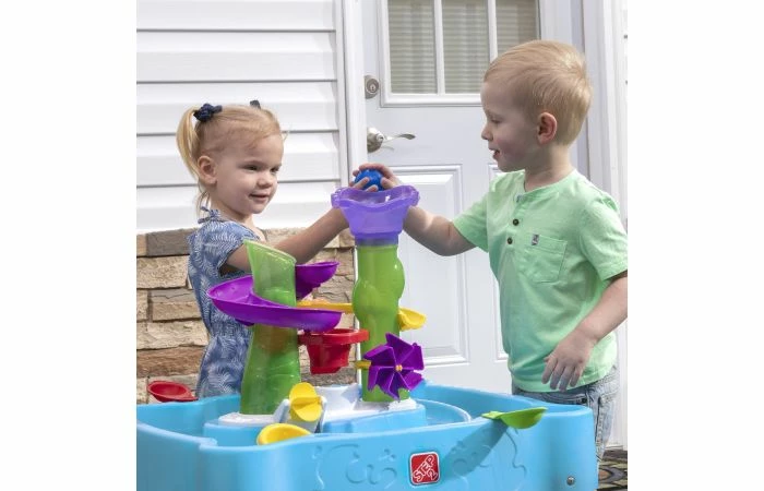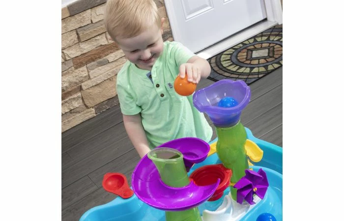Zet je schrap voor spetterend plezier met de Rising River Water & Ball watertafel van Step2. Deze watertafel zit vol met verrassingen en combineer het plezier van een watertafel met speelballen. Laat de ballen in de ene toren vallen, giet water in de andere en kijk hoe de ballen weer omhoog komen! Je kindje kan zien hoe de ballen helemaal omhoog gaan en vervolgens in het doolhof vallen of weer naar beneden gaan in de spiraalvormige watertoren. Het is net magie! Als het water in het doolhof wordt gegoten kunnen peuter oorzaak en gevolg herkennen wanneer de spinners worden geactiveerd en het water in het bassin beneden spettert. Met de schenkbekers, zijflippers en speelballen oefenen kinderen tijdens het spelen niet alleen hun fijne motoriek, maar oefenen ze ook sociale vaardigheden.
