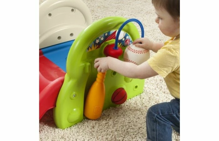 Glijbaan voor de allerkleinsten met diverse extra’s. Ideaal voor binnen en buitengebruik; dus ook met minder mooi weer kan je kindje lekker genieten van z’n eerste klimtoestel. Ook kunnen hiermee de eerste sporten beoefend worden: basketbal, voetbal en baseball. Nu nog kiezen in welke van de drie sporten je kind een pro wordt. Na het opruimen kunnen de accessoires weer vastgeklikt worden aan de glijbaan.
