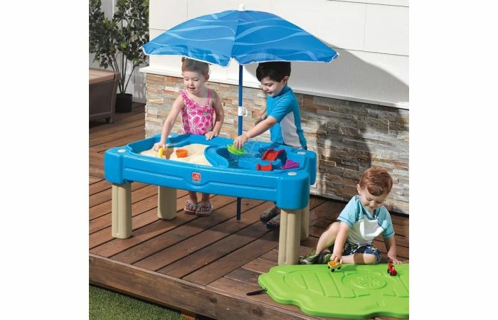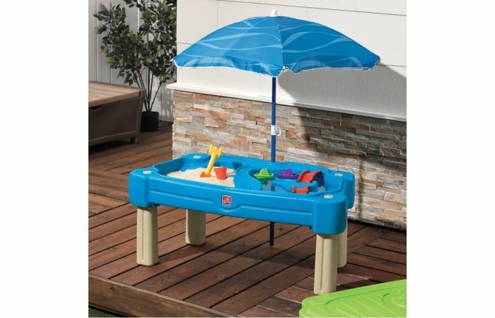 Met deze Step2 Cascading Cove Sand & Water Table kunnen kinderen net doen alsof ze de Zeven Zeeën bevaren en op een eiland aankomen om schatten op te graven! Deze felgekleurde alles-in-één activiteitentafel biedt zintuiglijk speelplezier voor iedereen! De kleintjes kunnen aan de ene kant zandkastelen bouwen en aan de andere kant speelgoedbootjes laten varen. Deze kinder zand- en watertafel is een geweldig buitenspeelgoed dat kinderen uren fantasierijke speelplezier biedt. Laat het spetteren en graven beginnen met Step2.