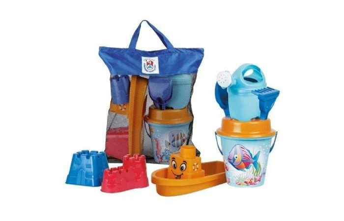 Deze handige 8–delige tas is gevuld met leuke strand accessoires; uitgevoerd in leuk Crazy Fish design. De set bestaat uit: een emmer inclusief hengsel met een doorsnede van 17 cm, een gieter met sproeikop, een harkje, een schepje, een bootje, 2 zandvormpjes en een zeef. De set is gemaakt van kunststof en heeft eenrobuust design voor jarenlang speelplezier. Ideaal om mee te badderen in bad of leuk voor aan het strand en door de meegeleverde tas extra handig om mee te nemen! Geschikt voor kinderen vanaf 1 jaar.                                                      Â
