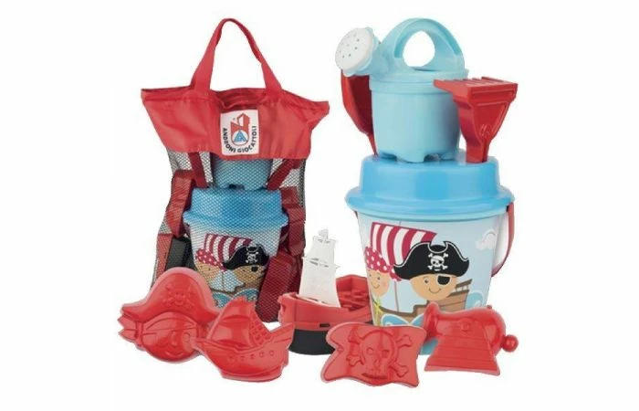 Deze handige 10–delige tas is gevuld met leuke strand accessoires; uitgevoerd inleuk Pirate Adventures design. De set bestaat uit: een emmer inclusief hengsel met een doorsnede van 17 cm, een gieter met sproeikop, een harkje, een schepje, een bootje, 4 zandvormpjes en een zeef. De set is gemaakt van kunststof en heefteen robuust design voor jarenlang speelplezier. Ideaal om mee te badderen in badof leuk voor aan het strand en door de meegeleverde tas extra handig om mee te nemen! Geschikt voor kinderen vanaf 1 jaar.                                                      Â