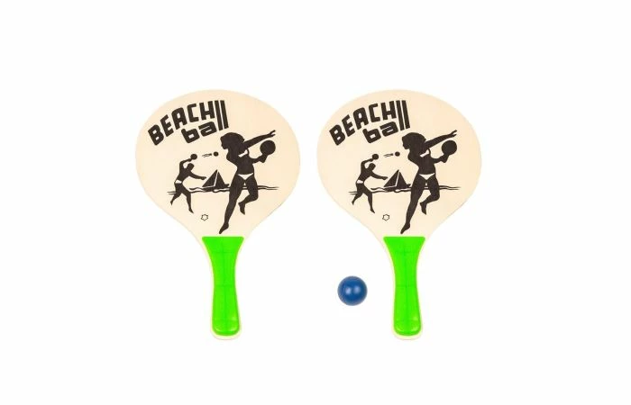 Summertime beachballset naturel met stranddecor. Lengte van het racket: 38 cm. Dikte: 8 mm. Wordt geleverd in net, inclusief pvc bal. Diameter van de bal: 4 cm. Geschikt voor kinderen vanaf 5 jaar.