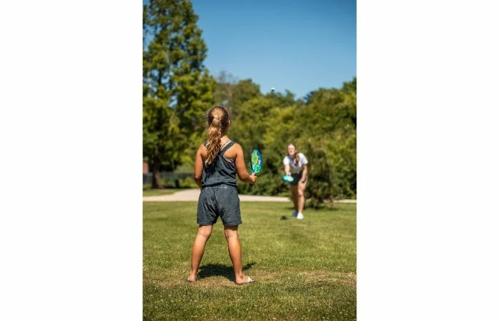Summertime Catch and Hit set: met de ene kant kun je beachballen en met de andere kant een kleefspel spelen! Lengte van het racket: 38 cm. Dikte: 8 mm. Met felgeleurd bloemdessin. Wordt inclusief tennisbal (diameter 4,5 cm) en pvc bal (diameter 4 cm) geleverd in net. Geschikt voor kinderen vanaf 5 jaar.