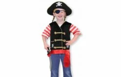 Inhoud: piratenvest met sabelhouder en sjerp, ooglapje, hoed en een zwaard van zacht materiaal