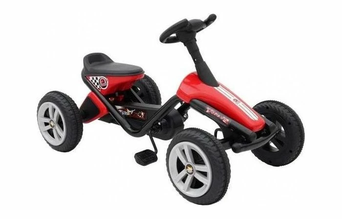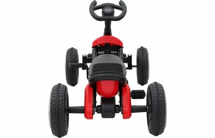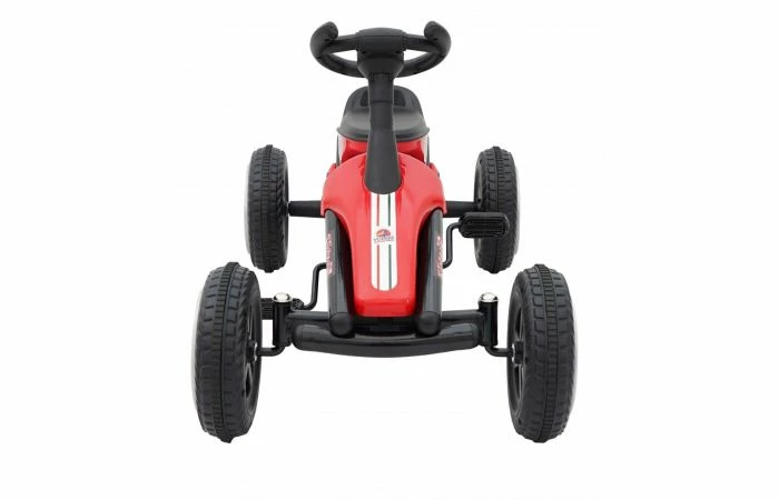 Deze Go Kart heeft vier plastic wielen met rubber profiel wat het rijden comfortabel maakt. De skelter heeft een metaal frame en een gesloten kettingkast. Het trapsysteem is vooruit en achteruit rijdend en heeft daardoor geen rem.