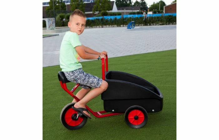 In de kunststof bak van deze oerdegelijke bakfiets kan je verschillende materialen kwijt die je overal heen kan transporteren. Verzamel de scheppen op het plein en breng ze naar de opbergbak. De bakfiets is robuust, veilig en duurzaam. Frame van buizenstaal, zonder scherpe hoeken of kanten.