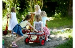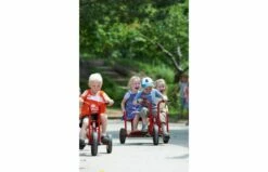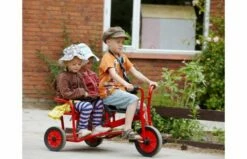 Stap samen met je vriendje achterop de taxi en race met z’n drieën het hele plein over. De taxi tweezits is robuust, veilig en duurzaam. Frame van buizenstaal, zonder scherpe hoeken of kanten. Achter deze driewieler kan een aanhanger gekoppeld worden met de veiligheidskoppeling.